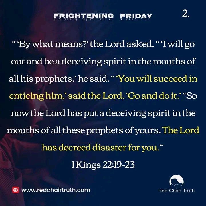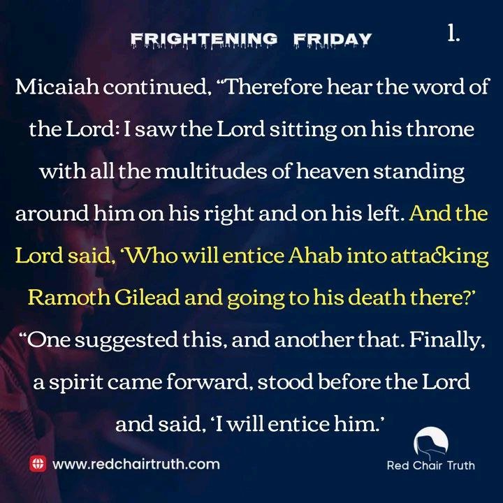 Micaiah continued, “Therefore, hear the word of the Lord: I saw the Lord sitting on his throne with all the multitudes of heaven standing around him on his right and on his left. And the Lord said, ‘Who will entice Ahab into attacking Ramoth Gilead and going to his death there?’. “One suggested this, and another that. Finally, a spirit came forward, stood before the Lord and said, ‘I will entice him.'” ‘By what means?’ the Lord asked, ” ‘I will go out and be a deceiving spirit in the mouths of all his prophets,’ he said. ” ‘You will succeed in enticing him,’ said the Lord. ‘Go and do it.’ “So now the Lord has put a deceiving spirit in the mouth of all these prophets of yours. The Lord has decreed disaster for you.”
