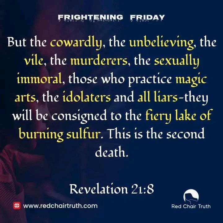 But the cowardly, the unbelieving, the vile, the murderers, the sexually immoral, those who practice magic arts, the idolaters and all liars-they will be consigned to the fiery lake of burning sulfur. This is the second death.