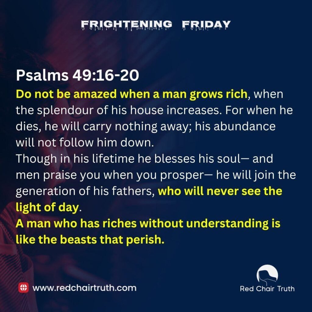 Do not be amazed when a man grows rich, when the splendour of his house increases. For when he dies, he will carry nothing away; his abundance will not follow him down. Though in his lifetime he blesses his soul- and men praise you when you prosper- he will join the generation of his fathers, who will never see the light of day. A man who has riches without understanding is like the beasts that perish.