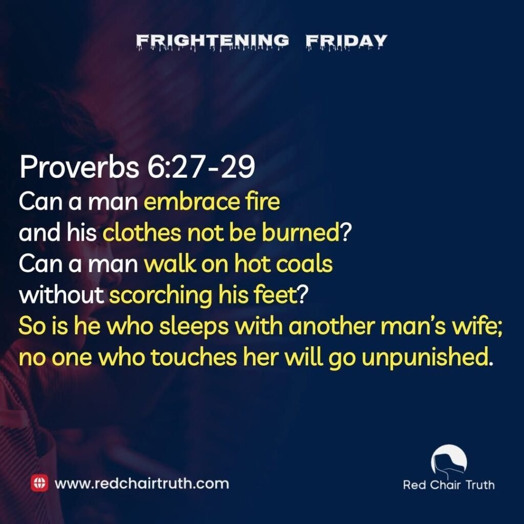 Can a man embrace fire and his clothes not be burned? Can a man walk on hot coals without scorching his feet? So is he who sleeps with another man’s wife; no one who touches her will go unpunished.