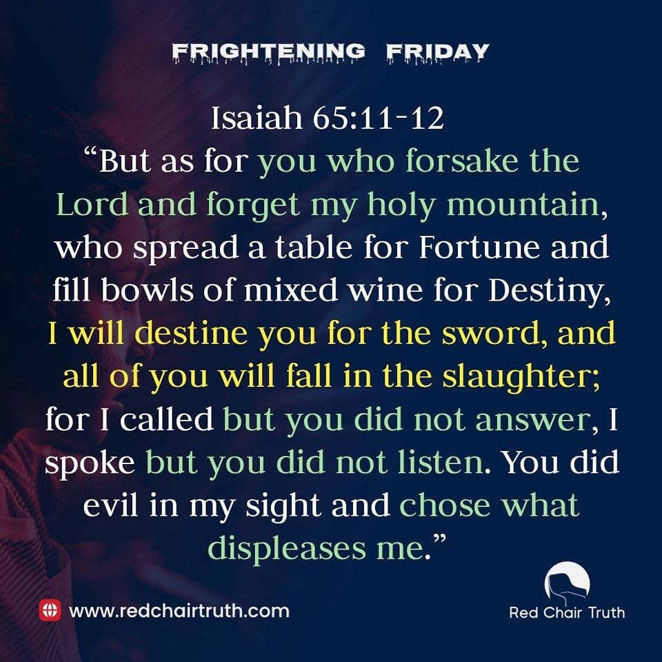“But as for you who forsake the Lord and forget my holy mountain, who spread a table for Fortune and fill bowls of mixed wine for Destiny, I will destine you for the sword, and all of you will fall in the slaughter; for I called but you did not answer, I spoke but you did not listen. You did evil in my sight and chose what displeases me.”
