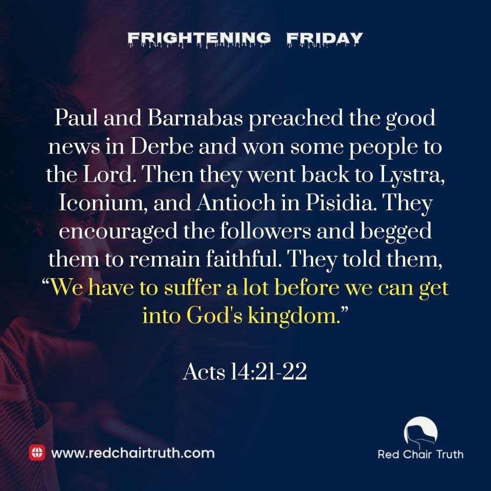 Paul and Barnabas preached the good news in Derbe and won some people to the Lord. Then they went back to Lystra, Iconium, and Antioch in Pisidia. They encouraged the followers and begged them to remain faithful. They told them, “We have to suffer a lot before we can get into God’s kingdom.”