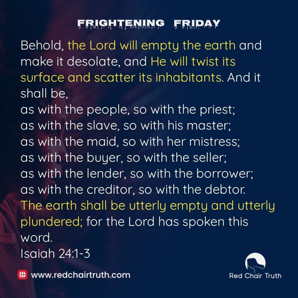 Behold, the Lord will empty the earth and make it desolate, and He will twist its surface and scatter its inhabitants. And it shall be, as with the people, so with the priest; as with the slave, so with his master; as with the maid, so with her mistress; as with the buyer, so with the seller; as with the lender, so with the borrower; as with the creditor, so with the debtor. The earth shall be utterly empty and utterly plundered; for the Lord has spoken this word.