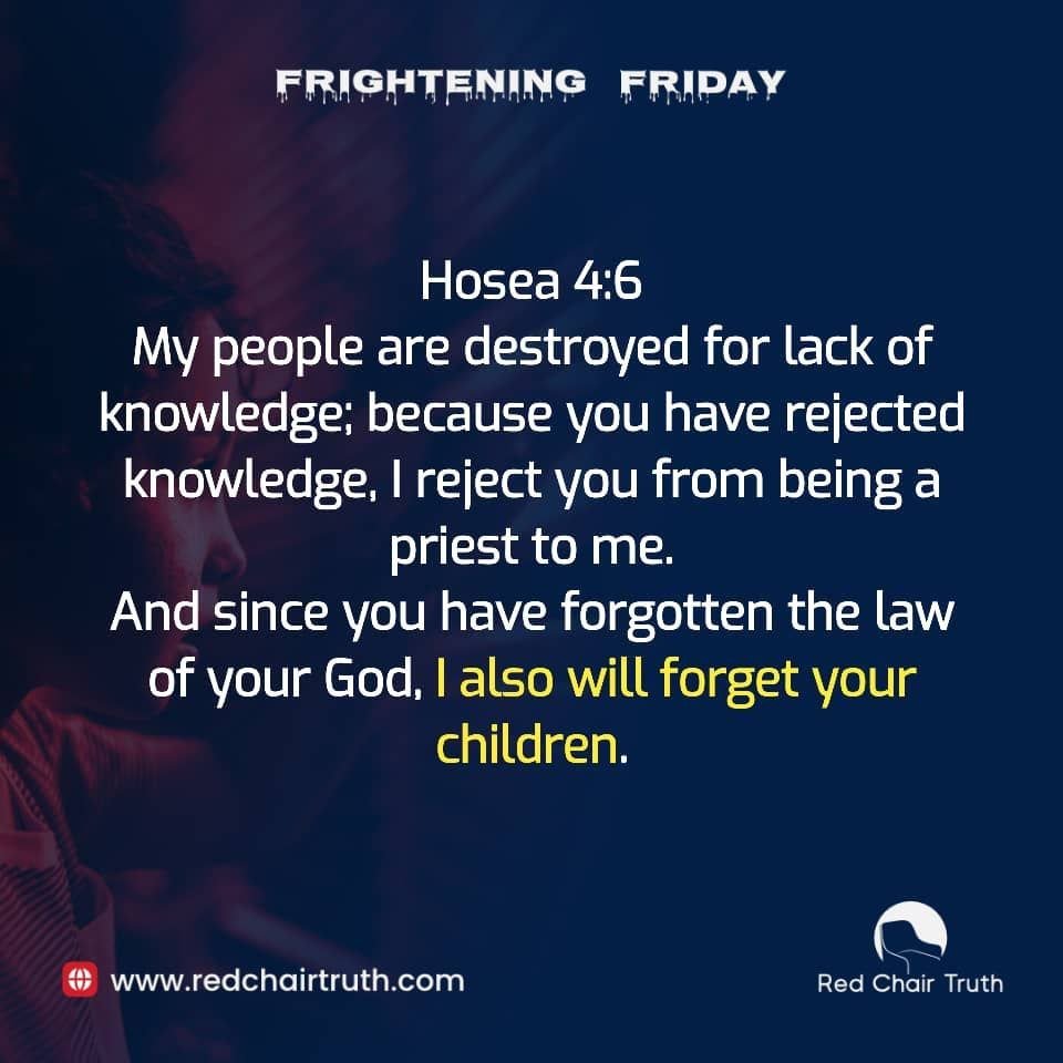My people are destroyed for lack of knowledge; because you have rejected knowledge, I reject you from being a priest to me. And since you have forgotten the law of your God, I also will forget your children.