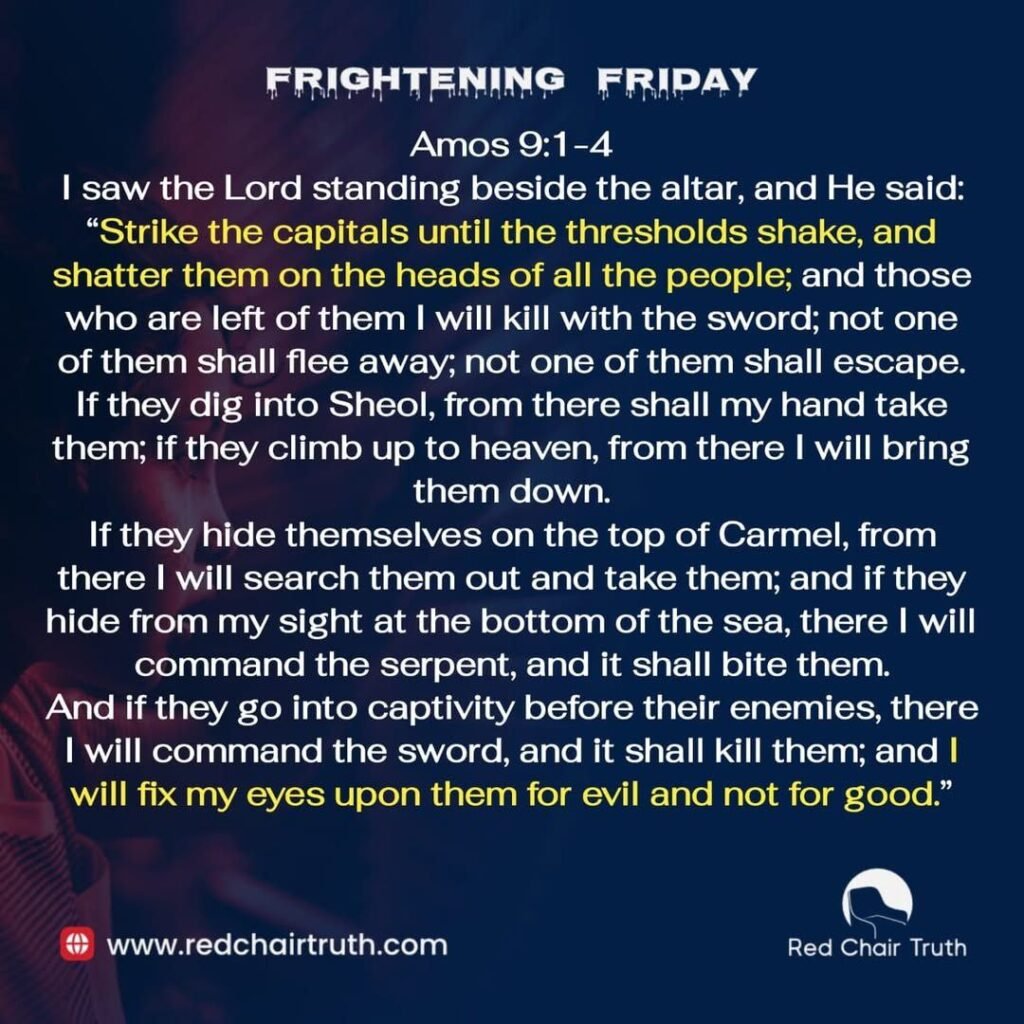 I saw the Lord standing beside the altar, and He said: “Strike the capitals until the thresholds shake, and shatter them on the heads of all the people; and those who are left of them I will kill with the sword; not one of them shall flee away; not one of them shall escape. If they dig into Sheol, from there shall my hand take them; if they climb up to heaven, from there I will bring them down.