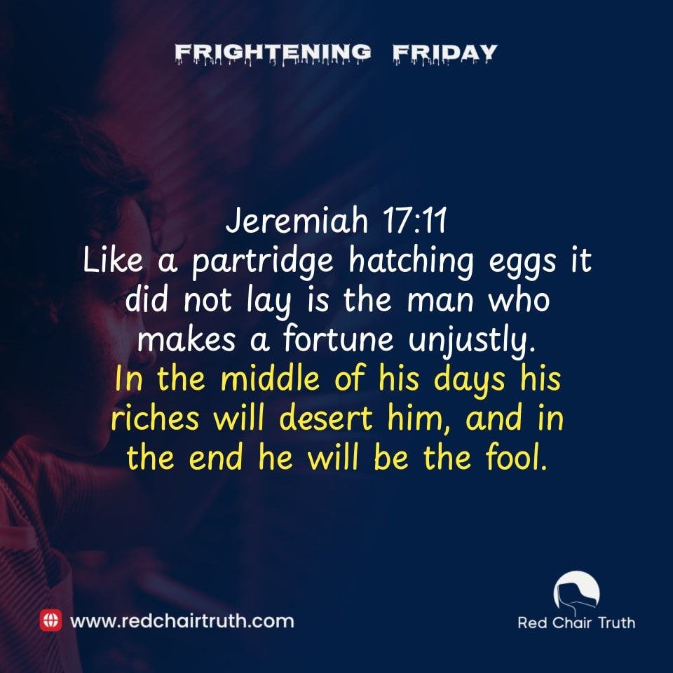 Like a partridge hatching eggs it did not lay is the man who makes a fortune unjustly. In the middle of his days his riches will desert him, and in the end he will be the fool.Like a partridge hatching eggs it did not lay is the man who makes a fortune unjustly. In the middle of his days his riches will desert him, and in the end he will be the fool.