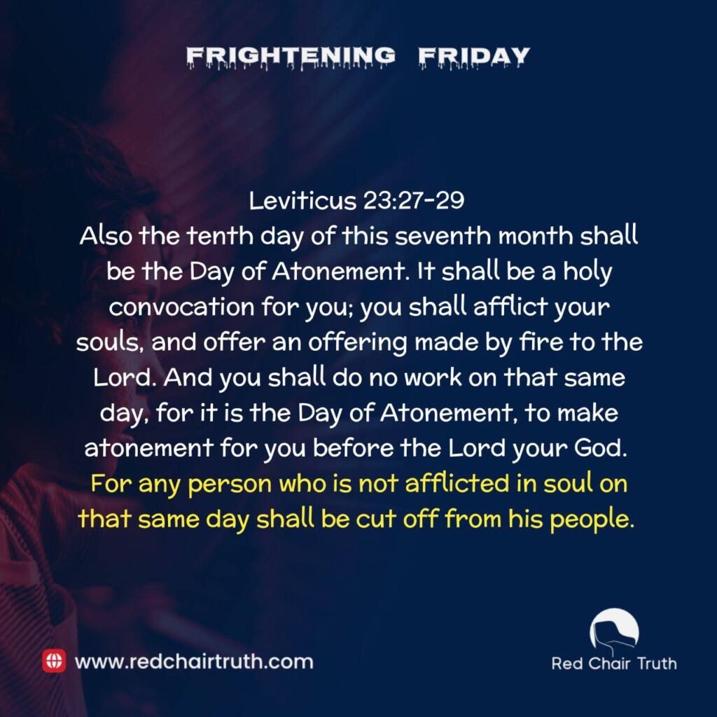 Also the tenth day of this seventh month shall be the Day of Atonement. It shall be a holy convocation for you; you shall afflict your souls, and offer an offering made by fire to the Lord. And you shall do no work on that same day, for it is the Day of Atonement, to make atonement for you before the Lord your God. For any person who is not afflicted in soul on that same day shall be cut off from his people.