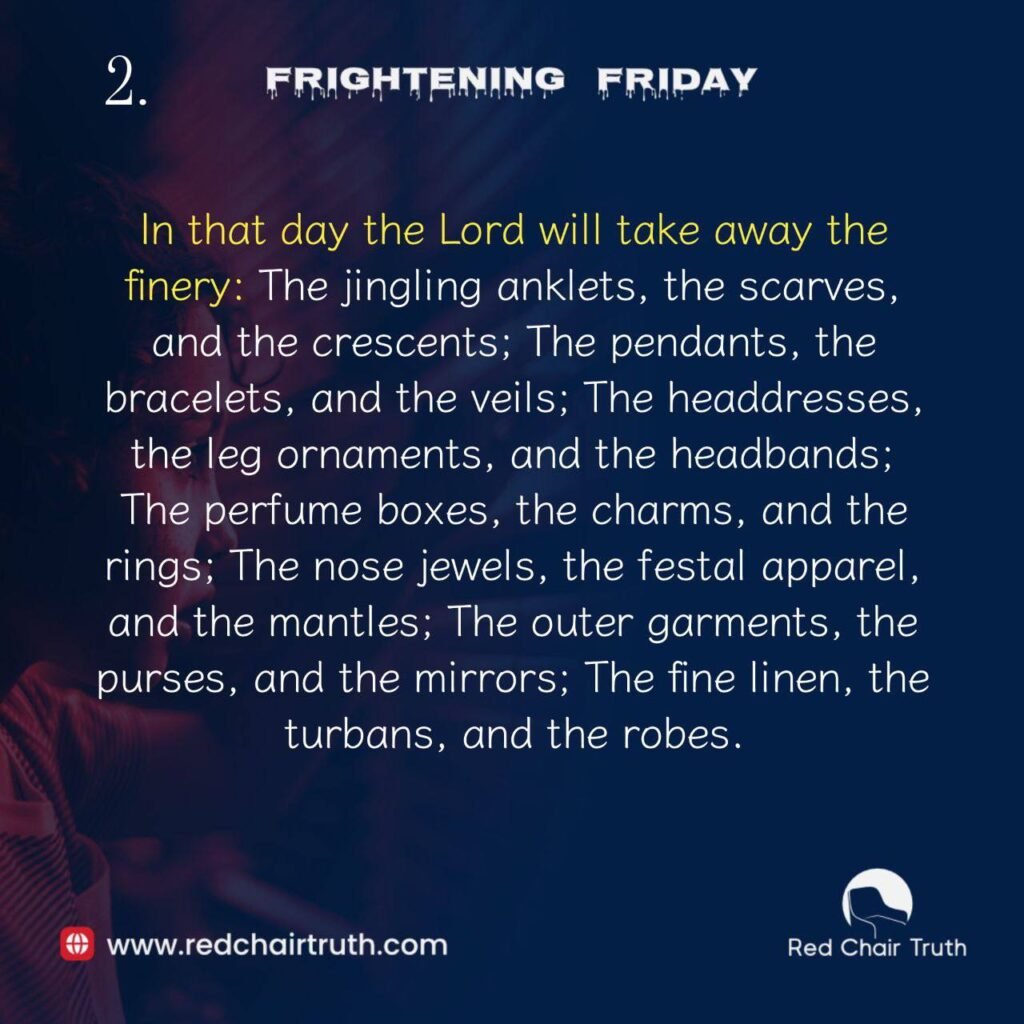 In that day the Lord will take away the finery: The jingling anklets, the scarves, and the crescents; The pendants, the bracelets, and the veils; The headdresses, the leg ornaments, and the headbands; The perfume boxes, the charms, and the rings; The nose jewels, the festal apparel, and the mantles; The outer garments, the purses, and the mirrors; The fine linen, the turbans, and the robes.