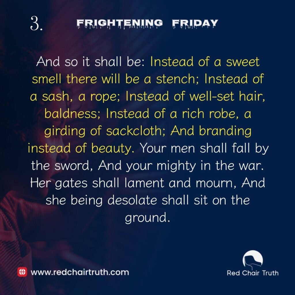 And so it shall be: Instead of a sweet smell there will be a stench; Instead of a sash, a rope; Instead of well-set hair, baldness; Instead of a rich robe, a girding of sackcloth; And branding instead of beauty. Your men shall fall by the sword, And your mighty in the war. Her gates shall lament and mourn, And she being desolate shall sit on the ground.