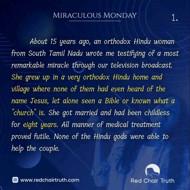 About 15 years ago, an orthodox Hindu woman from South Tamil Nadu wrote me testifying of a most remarkable miracle through our television broadcast. She grew up in a very orthodox Hindu home and village where none of them had even heard of the name Jesus, let alone seen a Bible or known what a “church” is. She got married and had been childless for eight years. All manner of medical treatment proved futile. None of the Hindu gods were able to help the couple.