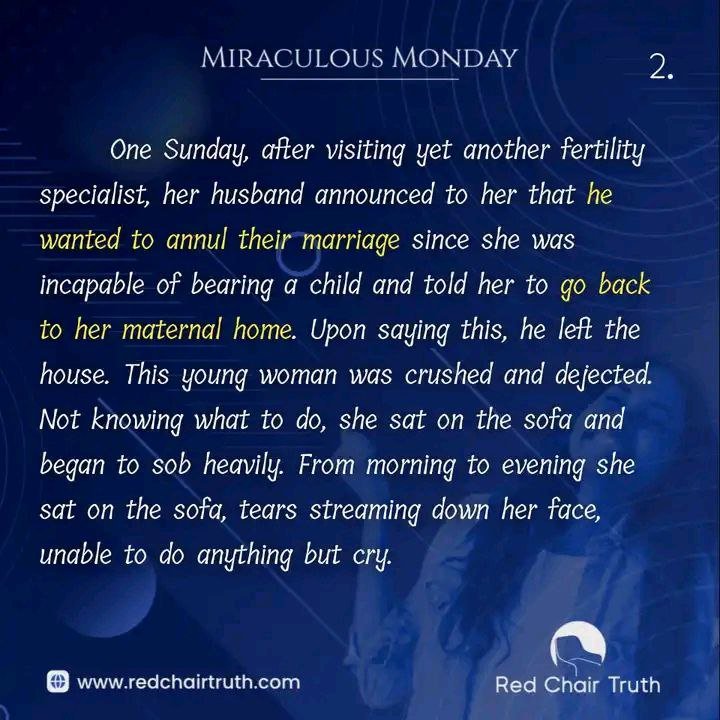 One Sunday, after visiting yet another fertility specialist, her husband announced to her that he wanted to annul their marriage since she was incapable of bearing a child and told her to go back to her maternal home. Upon saying this, he left the house. This young woman was crushed and dejected. Not knowing what to do, she sat on the sofa and began to sob heavily. From morning to evening she sat on the sofa, tears streaming down her face, unable to do anything but cry.