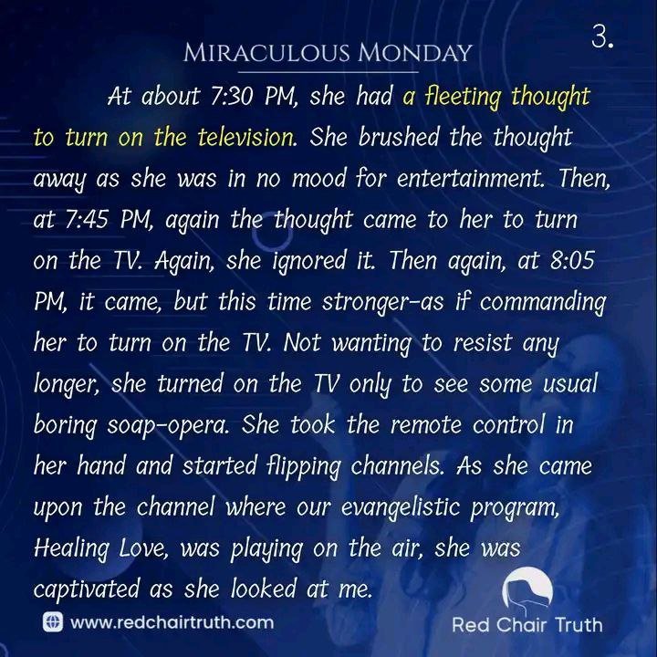 At about 7:30 PM, she had a fleeting thought to turn on the television. She brushed the thought away as she was in no mood for entertainment. Then, at 7:45 PM, again the thought came to her to turn on the TV. Again, she ignored it. Then again, at 8:05 PM, it came, but this time stronger—as if commanding her to turn on the TV. Not wanting to resist any longer, she turned on the TV only to see some usual boring soap-opera. She took the remote control in her hand and started flipping channels. As she came upon the channel where our evangelistic program, Healing Love, was playing on the air, she was captivated as she looked at me.