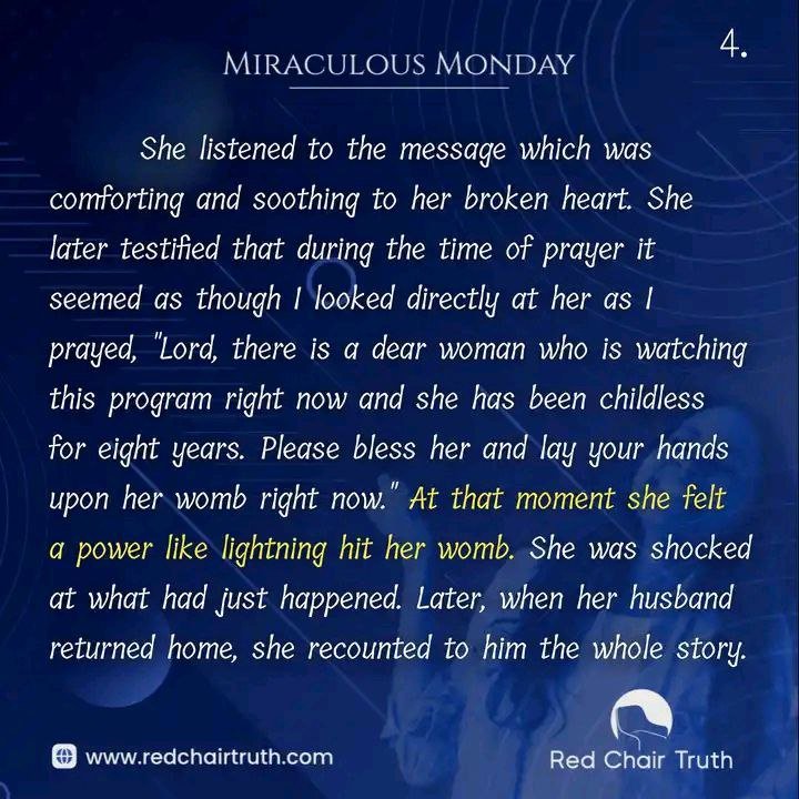 She listened to the message which was comforting and soothing to her broken heart. She later testified that during the time of prayer it seemed as though I looked directly at her as I prayed, “Lord, there is a dear woman who is watching this program right now and she has been childless for eight years. Please bless her and lay your hands upon her womb right now.” At that moment she felt a power like lightning hit her womb. She was shocked at what had just happened. Later, when her husband returned home, she recounted to him the whole story.