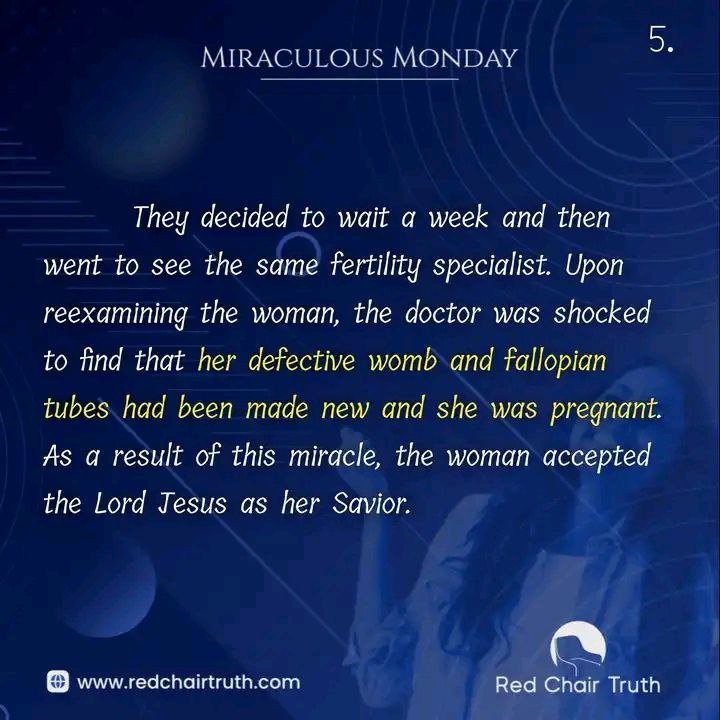 They decided to wait a week and then went to see the same fertility specialist. Upon reexamining the woman, the doctor was shocked to find that her defective womb and fallopian tubes had been made new and she was pregnant. As a result of this miracle, the woman accepted the Lord Jesus as her Savior.