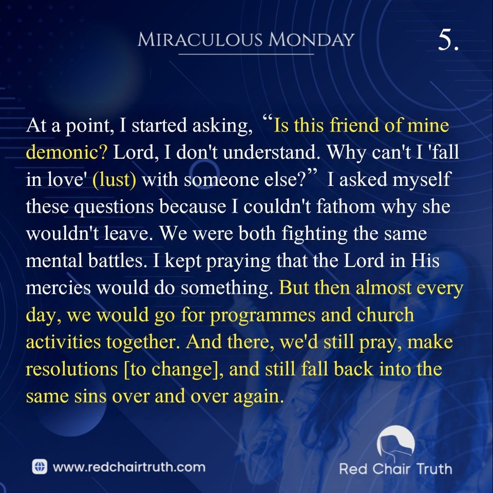 At a point, I started asking, “Is this friend of mine demonic? Lord, I don’t understand. Why can’t I ‘fall in love’ (lust) with someone else?” I asked myself these questions because I couldn’t fathom why she wouldn’t leave. We were both fighting the same mental battles. I kept praying that the Lord in His mercies would do something. But then almost every day, we would go for programmes and church activities together. And there, we’d still pray, make resolutions [to change], and still fall back into the same sins over and over again.