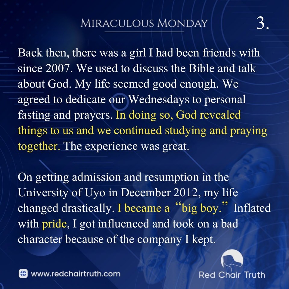 Back then, there was a girl I had been friends with since 2007. We used to discuss the Bible and talk about God. My life seemed good enough. We agreed to dedicate our Wednesdays to personal fasting and prayers. In doing so, God revealed things to us and we continued studying and praying together. The experience was great.