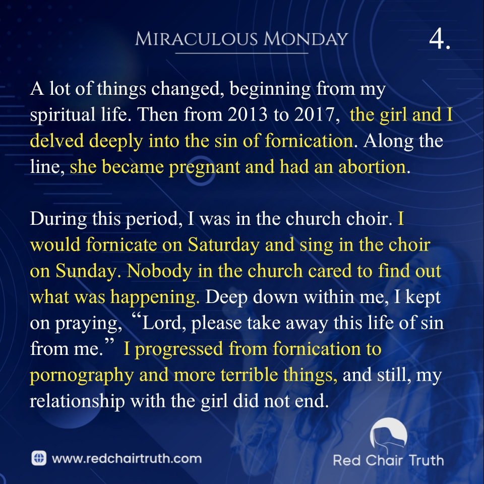 A lot of things changed, beginning from my spiritual life. Then from 2013 to 2017, the girl and I delved deeply into the sin of fornication. Along the line, she became pregnant and had an abortion.