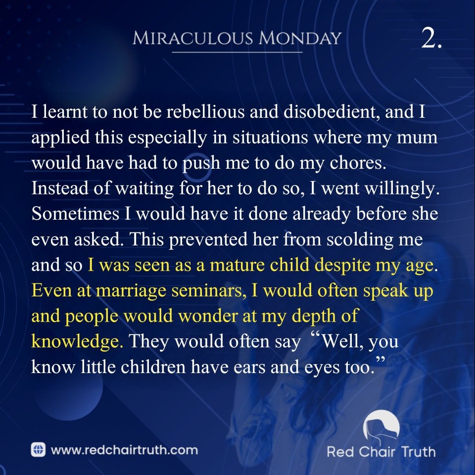 I learnt to not be rebellious and disobedient, and I applied this especially in situations where my mum would have had to push me to do my chores. Instead of waiting for her to do so, I went willingly. Sometimes I would have it done already before she even asked. This prevented her from scolding me and so I was seen as a mature child despite my age. Even at marriage seminars, I would often speak up and people would wonder at my depth of knowledge. They would often say, “Well, you know little children have ears and eyes too.”