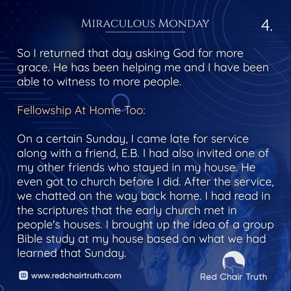 On a certain Sunday, I came late for service along with a friend, E.B. I had also invited another friend who stayed in my house. He even got to church before I did. After the service, we chatted on the way back home. I had read in the scriptures that the early church met in people’s houses, so I brought up the idea of a group Bible study at my house based on what we had learned that Sunday.