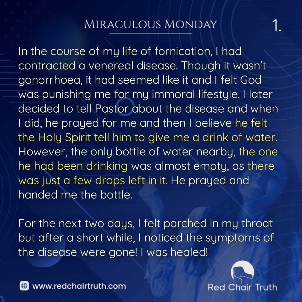 In the course of my life of fornication, I had contracted a venereal disease. Though it wasn’t gonorrhoea, it had seemed like it, and I felt God was punishing me for my immoral lifestyle. I later decided to tell Pastor about the disease, and when I did, he prayed for me. Then I believe he felt the Holy Spirit tell him to give me a drink of water. However, the only bottle of water nearby — the one he had been drinking — was almost empty, with just a few drops left in it.