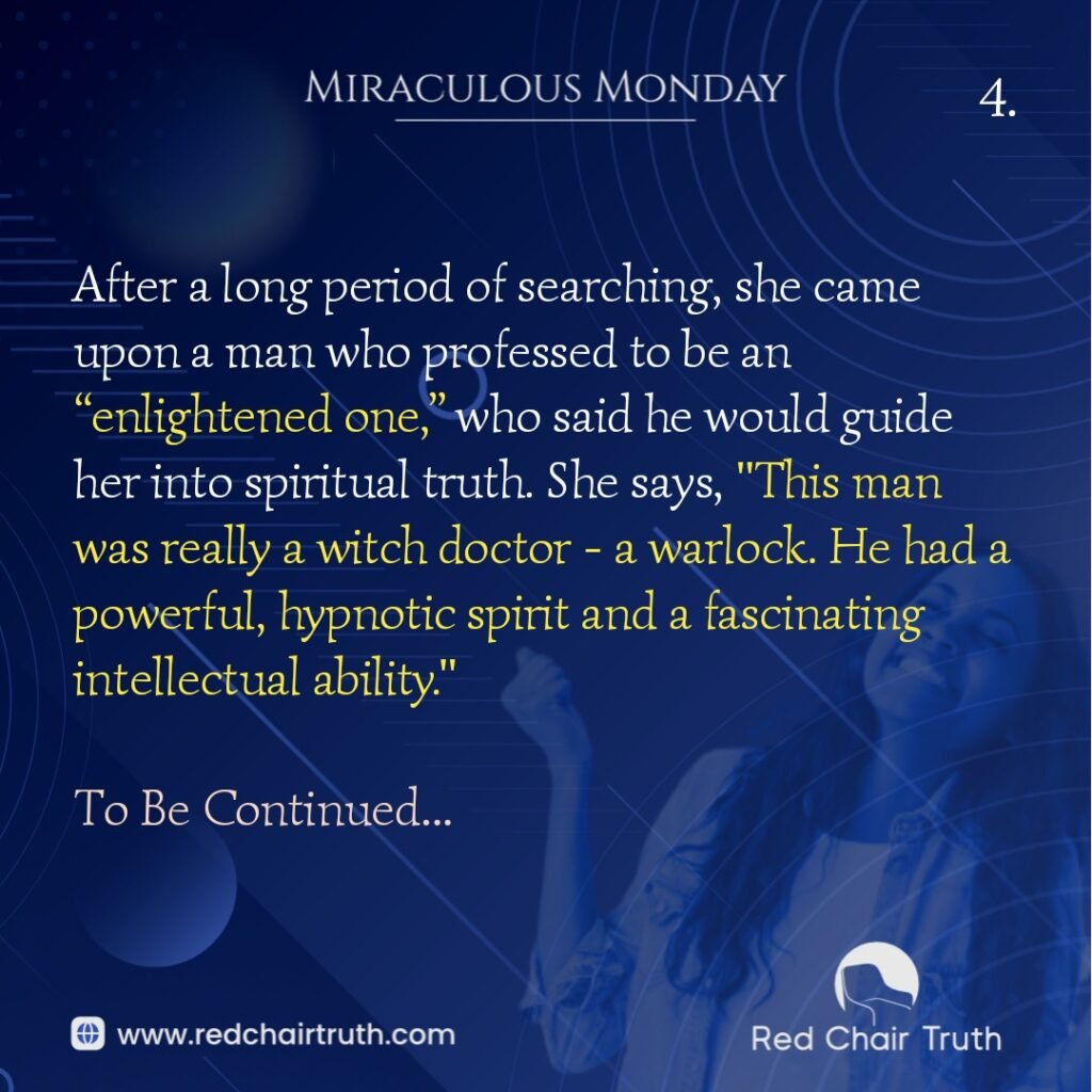 After a long period of searching, she came upon a man who professed to be an “enlightened one,” who said he would guide her into spiritual truth. She says, “This man was really a witch doctor – a warlock. He had a powerful, hypnotic spirit and a fascinating intellectual ability.”
