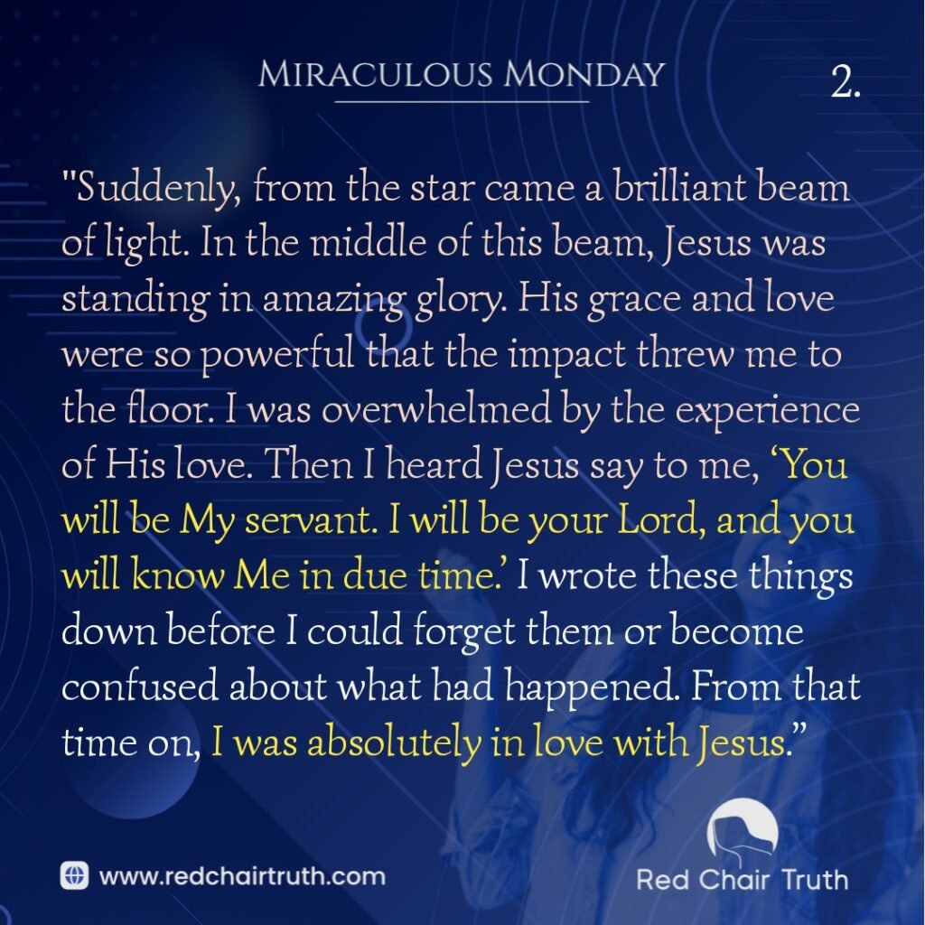 Suddenly, from the star came a brilliant beam of light. In the middle of this beam, Jesus was standing in amazing glory. His grace and love were so powerful that the impact threw me to the floor. I was overwhelmed by the experience of His love. Then I heard Jesus say to me, ‘You will be My servant. I will be your Lord, and you will know Me in due time.’