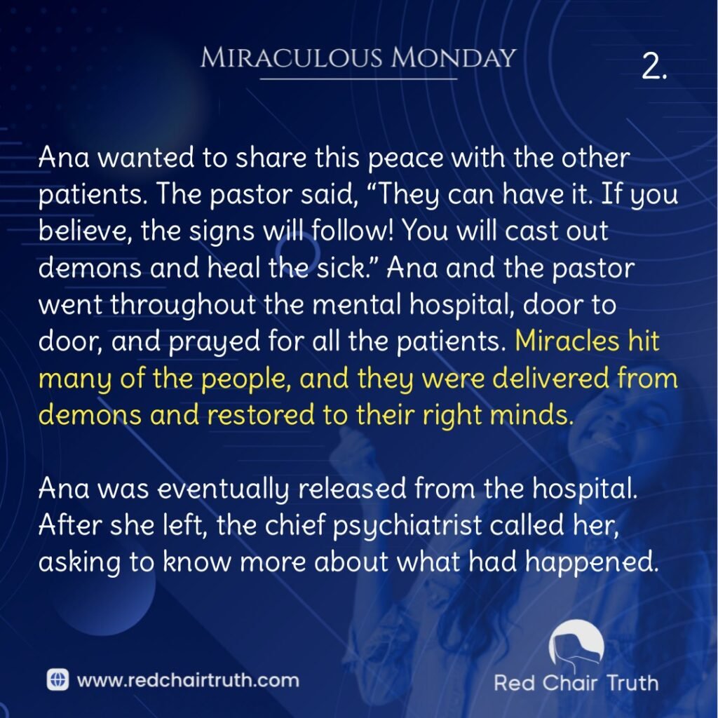 Ana wanted to share this peace with the other patients. The pastor said, “They can have it. If you believe, the signs will follow! You will cast out demons and heal the sick.” Ana and the pastor went throughout the mental hospital, door to door, and prayed for all the patients. Miracles hit many of the people, and they were delivered from demons and restored to their right minds.