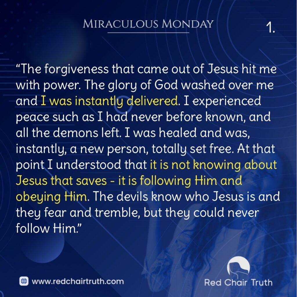 “The forgiveness that came out of Jesus hit me with power. The glory of God washed over me and I was instantly delivered. I experienced peace such as I had never before known, and all the demons left. I was healed and was, instantly, a new person, totally set free. At that point I understood that it is not knowing about Jesus that saves – it is following Him and obeying Him. The devils know who Jesus is and they fear and tremble, but they could never follow Him.”