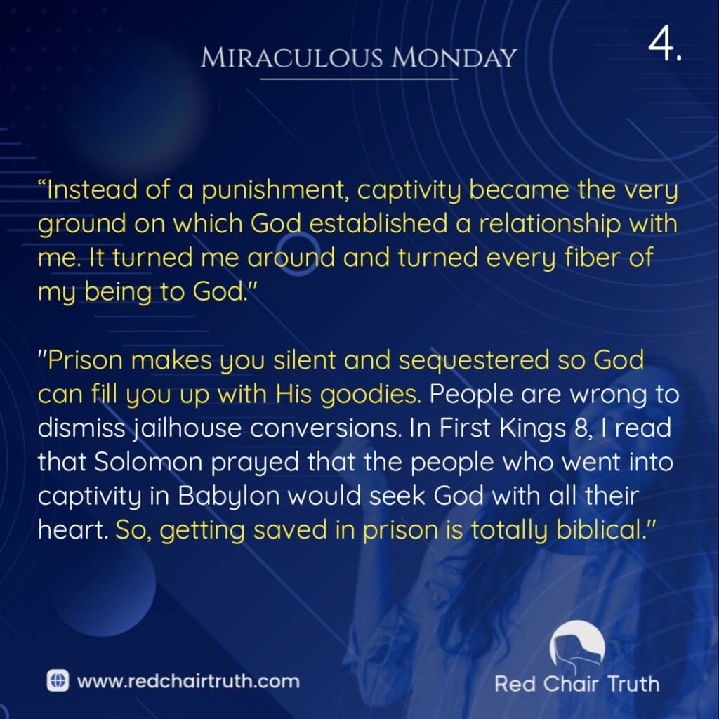 “Prison makes you silent and sequestered so God can fill you up with His goodies. People are wrong to dismiss jailhouse conversions. In First Kings 8, I read that Solomon prayed that the people who went into captivity in Babylon would seek God with all their heart. So, getting saved in prison is totally biblical.”