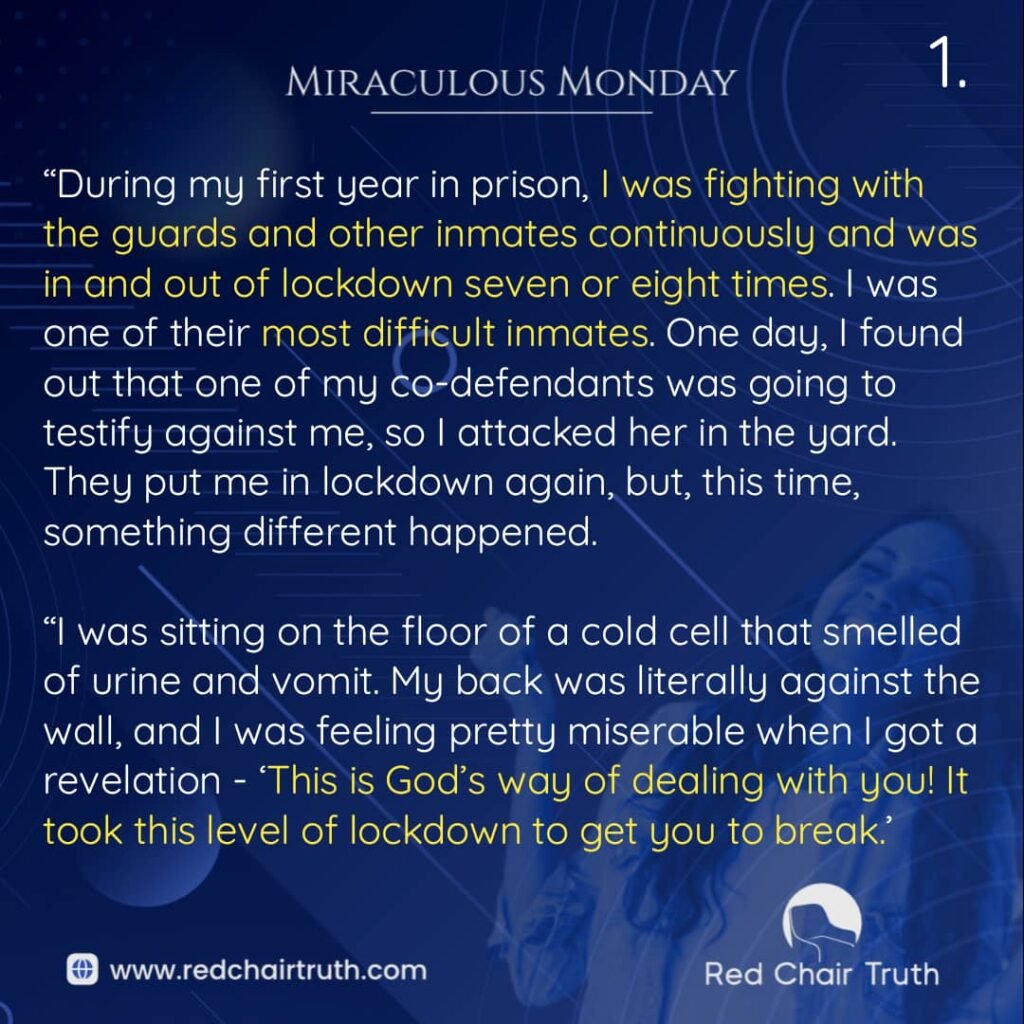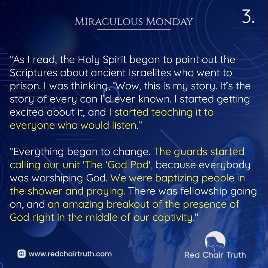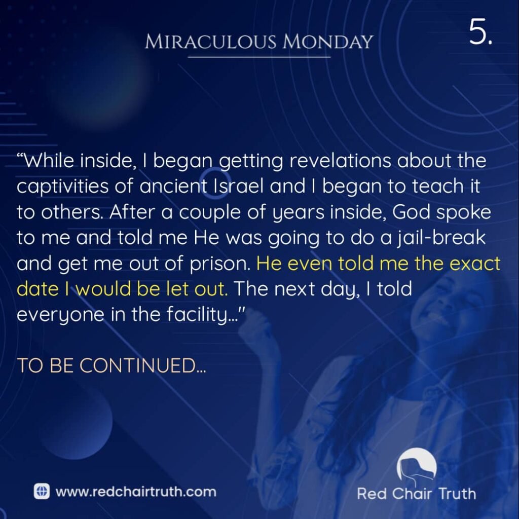 “While inside, I began getting revelations about the captivities of ancient Israel and I began to teach it to others. After a couple of years inside, God spoke to me and told me He was going to do a jail-break and get me out of prison. He even told me the exact date I would be let out. The next day, I told everyone in the facility…”