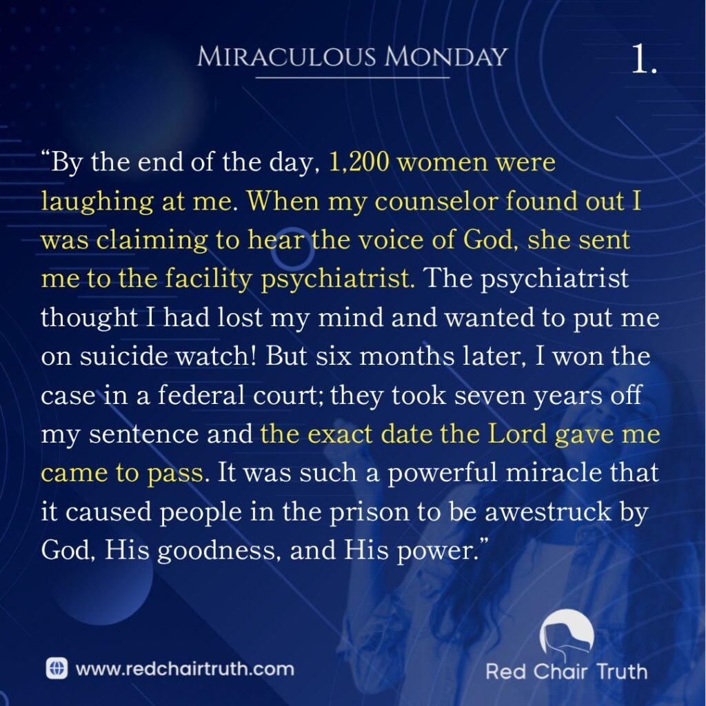 “By the end of the day, 1,200 women were laughing at me. When my counselor found out I was claiming to hear the voice of God, she sent me to the facility psychiatrist. The psychiatrist thought I had lost my mind and wanted to put me on suicide watch! But six months later, I won the case in a federal court; they took seven years off my sentence and the exact date the Lord gave me came to pass. It was such a powerful miracle that it caused people in the prison to be awestruck by God, His goodness, and His power.”
