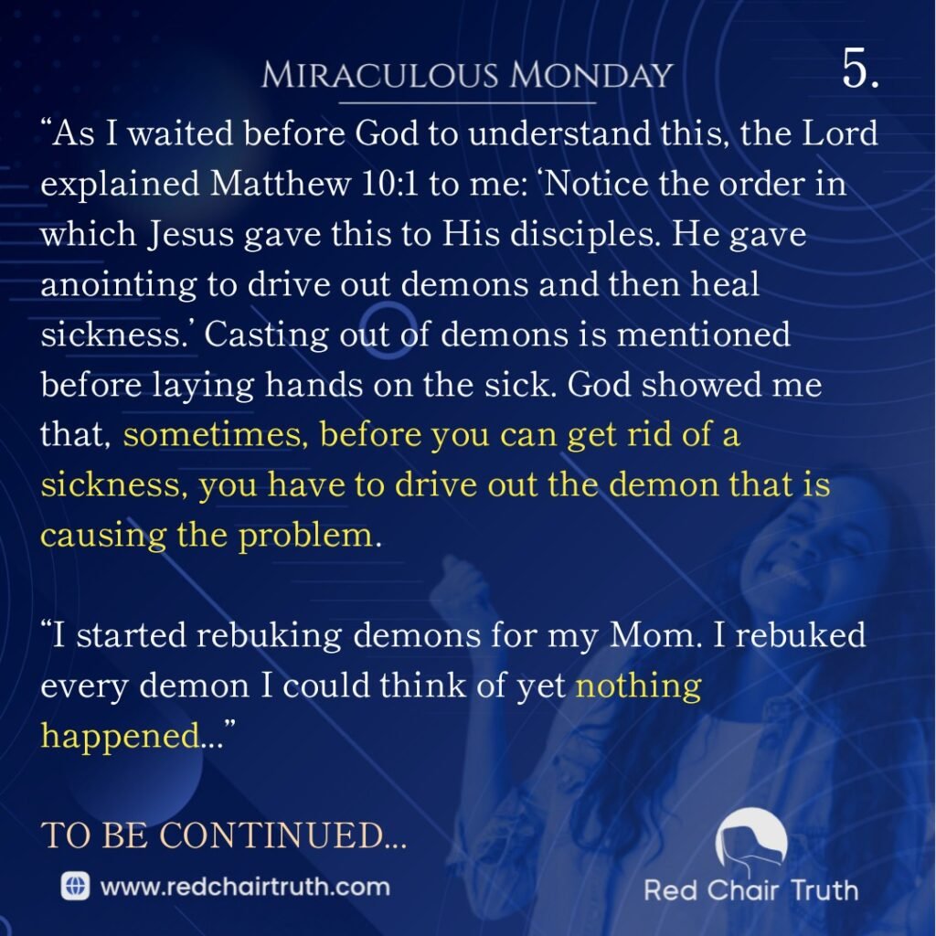 “As I waited before God to understand this, the Lord explained Matthew 10:1 to me: ‘Notice the order in which Jesus gave this to His disciples. He gave anointing to drive out demons and then heal sickness.’ Casting out of demons is mentioned before laying hands on the sick. God showed me that, sometimes, before you can get rid of a sickness, you have to drive out the demon that is causing the problem.