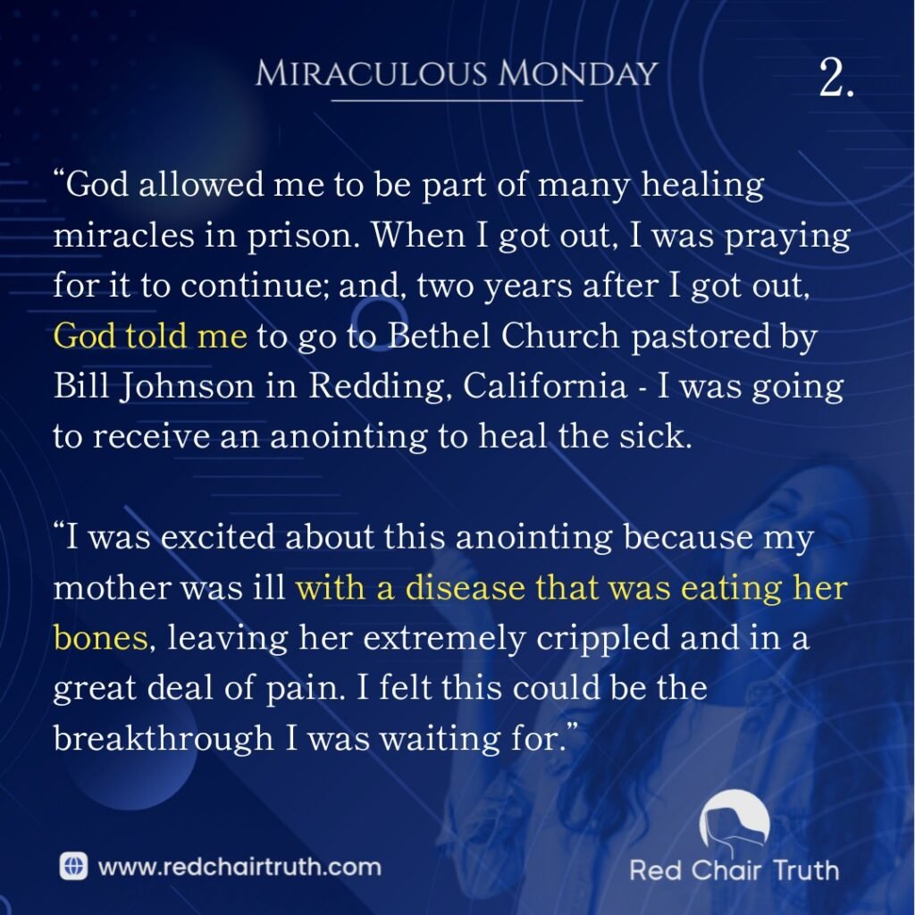 “God allowed me to be part of many healing miracles in prison. When I got out, I was praying for it to continue; and, two years after I got out, God told me to go to Bethel Church pastored by Bill Johnson in Redding, California – I was going to receive an anointing to heal the sick.