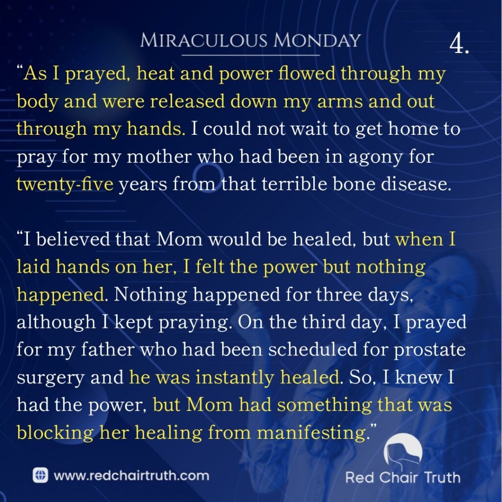 “I believed that Mom would be healed, but when I laid hands on her, I felt the power but nothing happened. Nothing happened for three days, although I kept praying. On the third day, I prayed for my father who had been scheduled for prostate surgery and he was instantly healed. So, I knew I had the power, but Mom had something that was blocking her healing from manifesting.”
