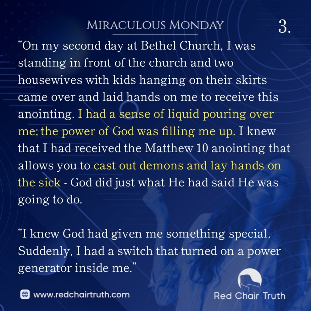 “On my second day at Bethel Church, I was standing in front of the church and two housewives with kids hanging on their skirts came over and laid hands on me to receive this anointing. I had a sense of liquid pouring over me; the power of God was filling me up. I knew that I had received the Matthew 10 anointing that allows you to cast out demons and lay hands on the sick – God did just what He had said He was going to do.