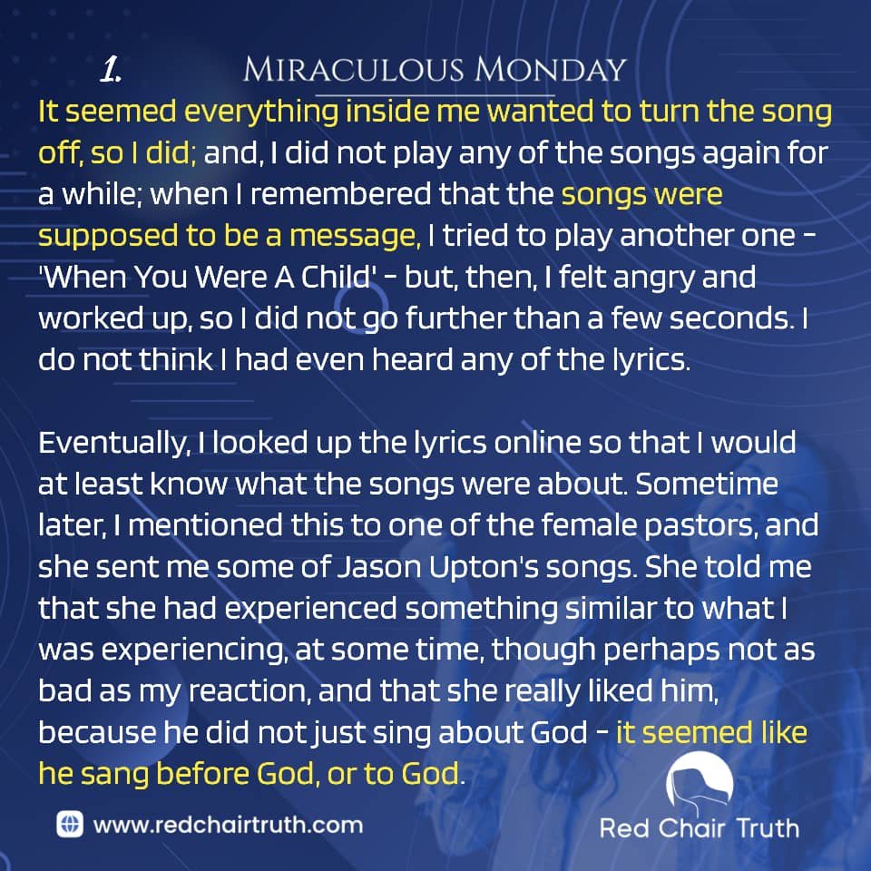 I resolved to listen to at least one of them, from beginning to end. I stopped feeling angry and flustered after a minute or two; and, after then, I did not feel all those weird feelings anymore. In fact, after a short time, I loved them, and the Lord spoke to me a lot through Jason Upton’s music.
