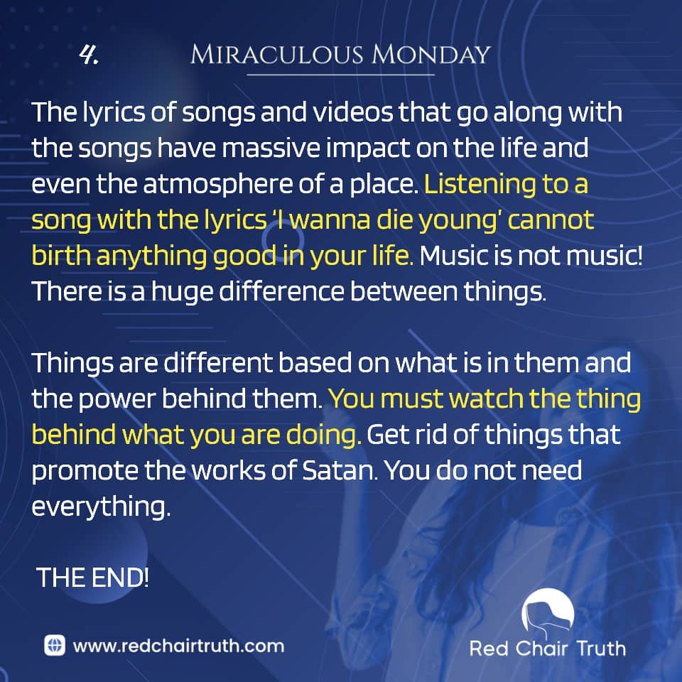 The lyrics of songs and videos that go along with the songs have massive impact on the life and even the atmosphere of a place. Listening to a song with the lyrics ‘I wanna die young’ cannot birth anything good in your life. Music is not music! There is a huge difference between things.