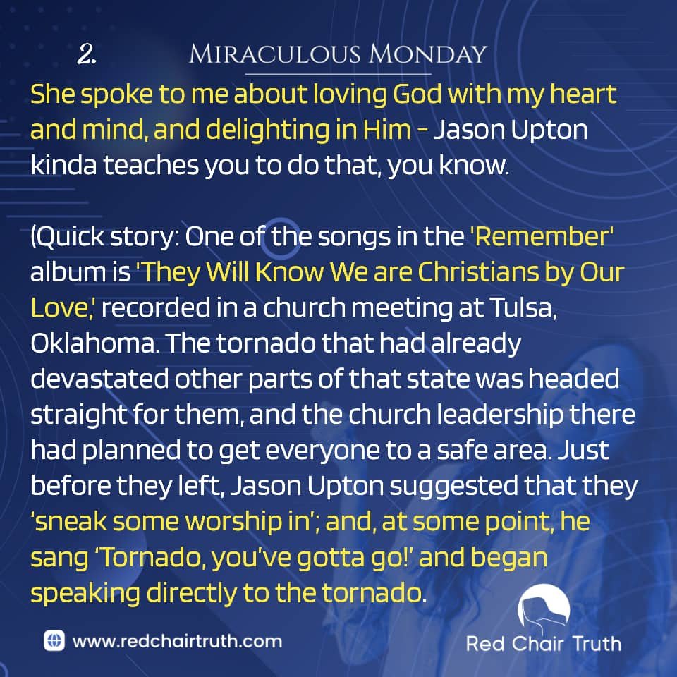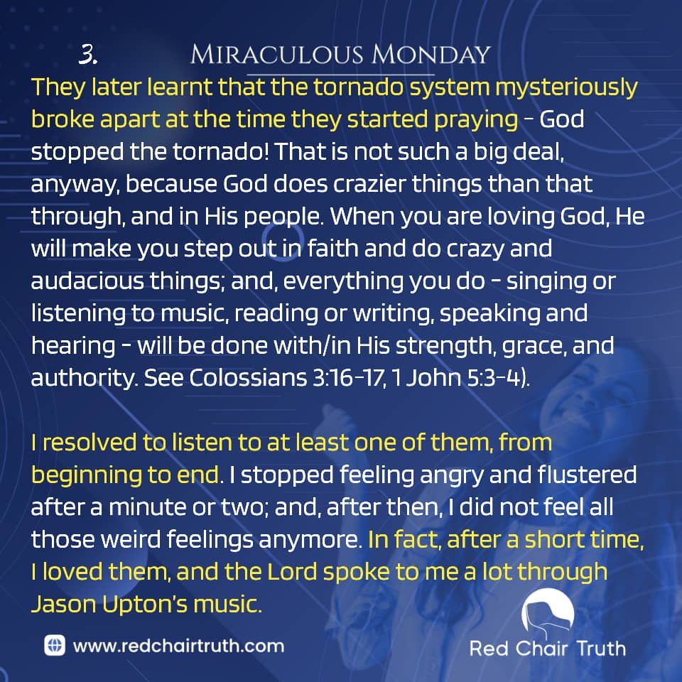 They later learnt that the tornado system mysteriously broke apart at the time they started praying – God stopped the tornado! That is not such a big deal, anyway, because God does crazier things than that through, and in His people. When you are loving God, He will make you step out in faith and do crazy and audacious things; and, everything you do – singing or listening to music, reading or writing, speaking and hearing – will be done with/in His strength, grace, and authority. See Colossians 3:16-17, 1 John 5:3-4).