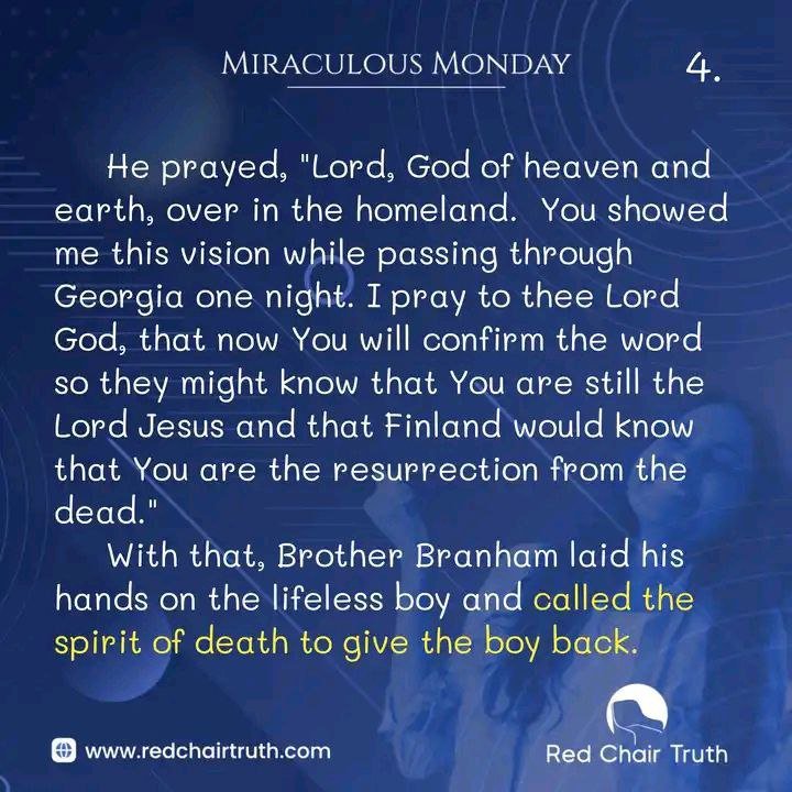 He prayed, “Lord, God of heaven and earth, over in the homeland. You showed me this vision while passing through Georgia one night. I pray to thee Lord God, that now You will confirm the word so they might know that You are still the Lord Jesus and that Finland would know that You are the resurrection from the dead.” With that, Brother Branham laid his hands on the lifeless boy and called the spirit of death to give the boy back.