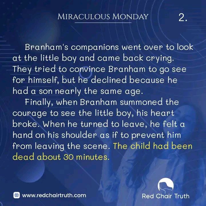 Branham’s companions went over to look at the little boy and came back crying. They tried to convince Branham to go see for himself, but he declined because he had a son nearly the same age. Finally, when Branham summoned the courage to see the little boy, his heart broke. When he turned to leave, he felt a hand on his shoulder as if to prevent him from leaving the scene. The child had been dead about 30 minutes.