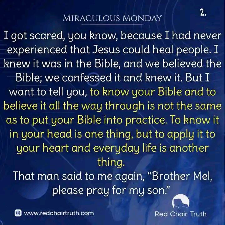 I got scared, you know, because I had never experienced that Jesus could heal people. I knew it was in the Bible, and we believed the Bible; we confessed it and knew it. But I want to tell you, to know your Bible and to believe it all the way through is not the same as to put your Bible into practice. To know it in your head is one thing, but to apply it to your heart and everyday life is another thing.