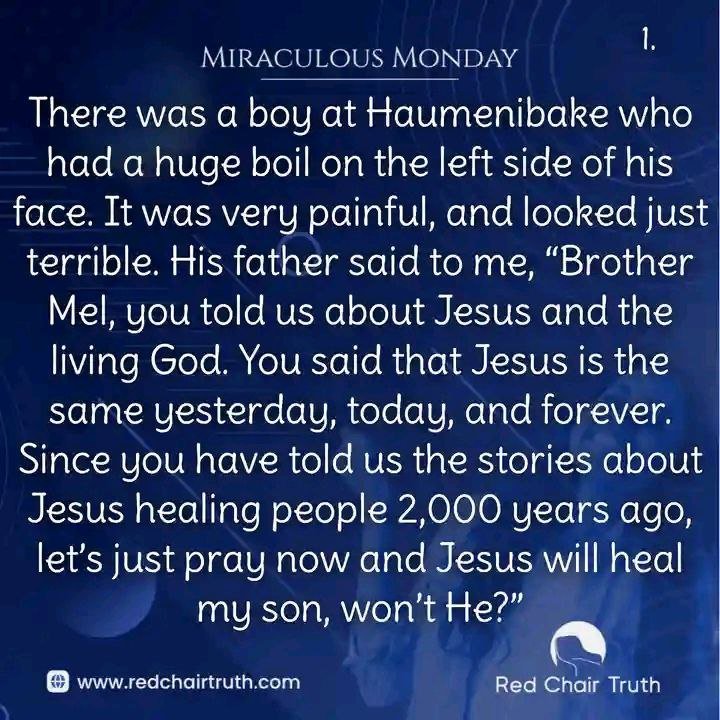 There was a boy at Haumenibake who had a huge boil on the left side of his face. It was very painful, and looked just terrible. His father said to me, “Brother Mel, you told us about Jesus and the living God. You said that Jesus is the same yesterday, today, and forever. Since you have told us the stories about Jesus healing people 2,000 years ago, let’s just pray now and Jesus will heal my son, won’t He?”