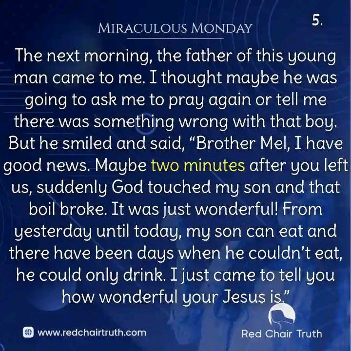 The next morning, the father of this young man came to me. I thought maybe he was going to ask me to pray again or tell me there was something wrong with that boy. But he smiled and said, “Brother Mel, I have good news. Maybe two minutes after you left us, suddenly God touched my son and that boil broke. It was just wonderful! From yesterday until today, my son can eat and there have been days when he couldn’t eat, he could only drink. I just came to tell you how wonderful your Jesus is.