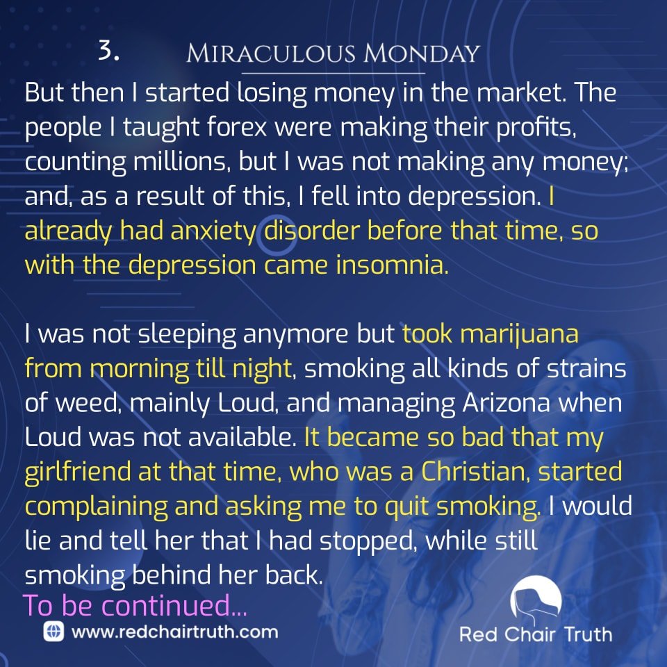 But then I started losing money in the market. The people I taught forex were making their profits, counting millions, but I was not making any money; and, as a result of this, I fell into depression. I already had anxiety disorder before that time, so with the depression came insomnia.