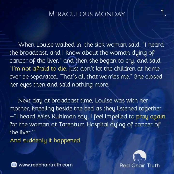 Next day at broadcast time, Louise was with her mother, kneeling beside the bed as they listened together -“I heard Miss Kuhlman say, I feel impelled to pray again for the woman at Tarentum Hospital dying of cancer of the liver.'” And suddenly it happened.
