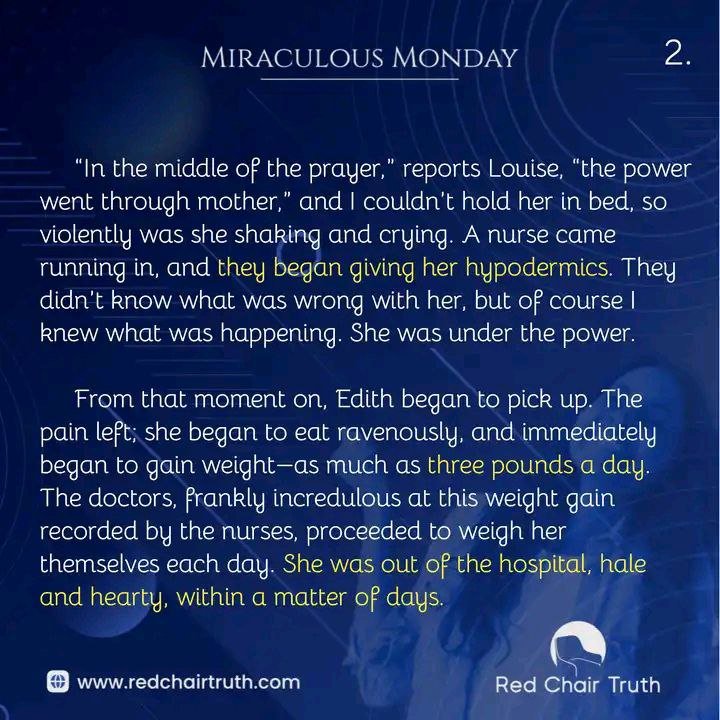 “In the middle of the prayer,” reports Louise, “the power went through mother,” and I couldn’t hold her in bed, so violently was she shaking and crying. A nurse came running in, and they began giving her hypodermics. They didn’t know what was wrong with her, but of course I knew what was happening. She was under the power. From that moment on, Edith began to pick up. The pain left; she began to eat ravenously, and immediately began to gain weight—as much as three pounds a day. The doctors, frankly incredulous at this weight gain recorded by the nurses, proceeded to weigh her themselves each day. She was out of the hospital, hale and hearty, within a matter of days.