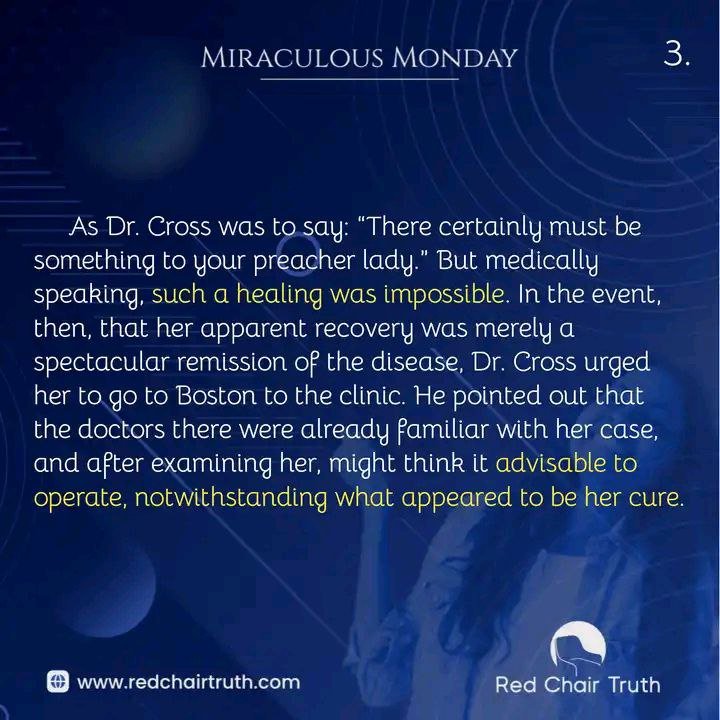 As Dr. Cross was to say: “There certainly must be something to your preacher lady.” But medically speaking, such a healing was impossible. In the event, then, that her apparent recovery was merely a spectacular remission of the disease, Dr. Cross urged her to go to Boston to the clinic. He pointed out that the doctors there were already familiar with her case, and after examining her, might think it advisable to operate, notwithstanding what appeared to be her cure.