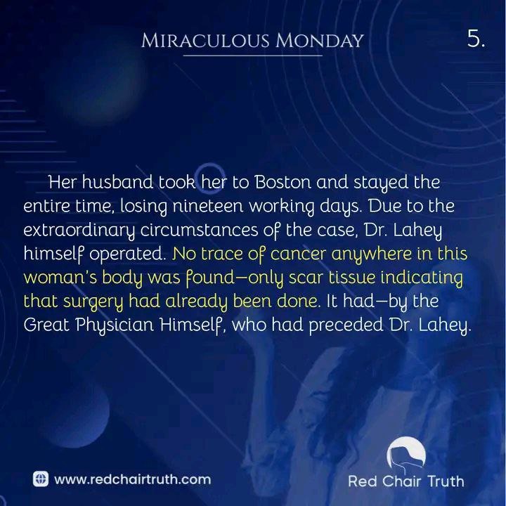 Her husband took her to Boston and stayed the entire time, losing nineteen working days. Due to the extraordinary circumstances of the case, Dr. Lahey himself operated. No trace of cancer anywhere in this woman’s body was found—only scar tissue indicating that surgery had already been done. It had—by the Great Physician Himself, who had preceded Dr. Lahey.