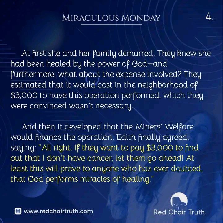 At first she and her family demurred. They knew she had been healed by the power of God—and furthermore, what about the expense involved? They estimated that it would cost in the neighborhood of $3,000 to have this operation performed, which they were convinced wasn’t necessary. And then it developed that the Miners’ Welfare would finance the operation. Edith finally agreed, saying: “All right. If they want to pay $3,000 to find out that I don’t have cancer, let them go ahead! At least this will prove to anyone who has ever doubted, that God performs miracles of healing.”