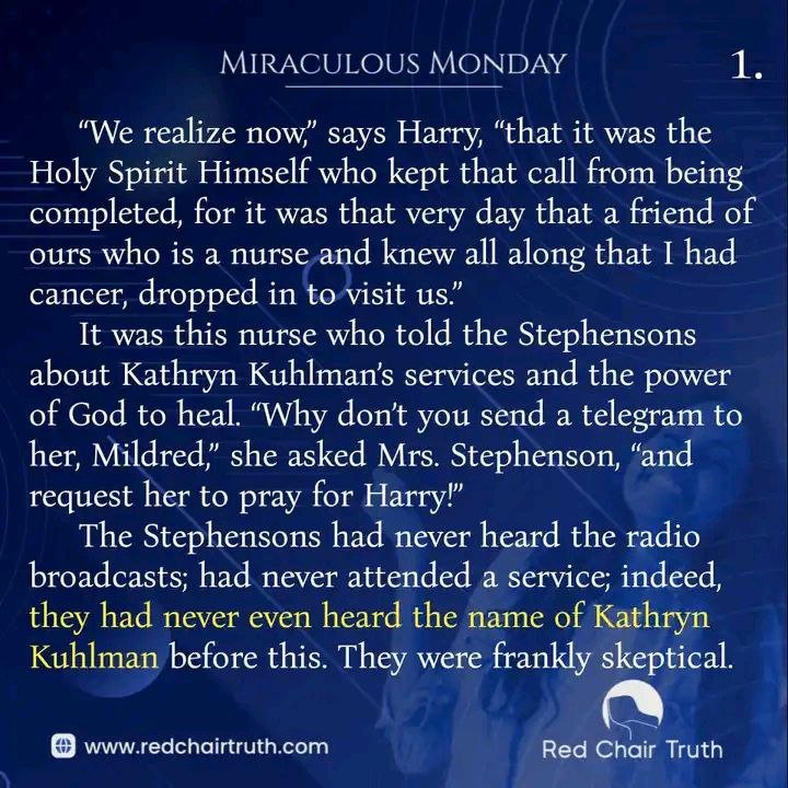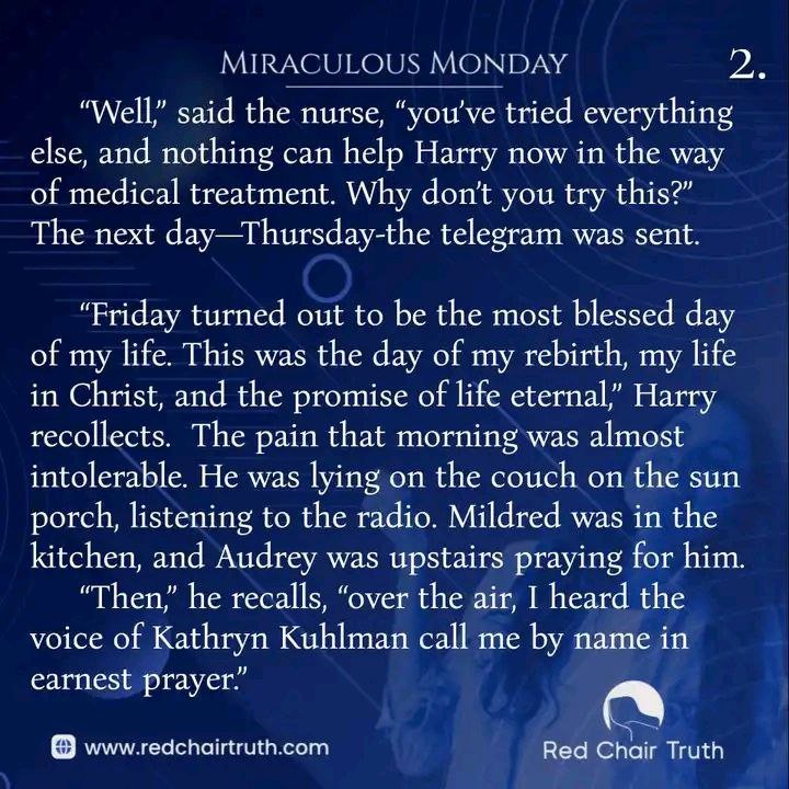 “Why don’t you send a telegram to her, Mildred,” she asked Mrs. Stephenson, “and request her to pray for Harry!” The Stephensons had never heard the radio broadcasts; had never attended a service; indeed, they had never even heard the name of Kathryn Kuhlman before this. They were frankly skeptical.